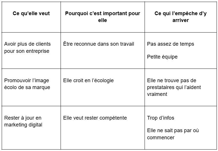 Imaginons qu’on ait discuté avec plusieurs clientes, lu leurs messages sur les réseaux sociaux et écouté ce que les équipes commerciales nous ont raconté à leur sujet.